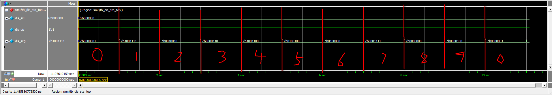 - 段选信号dis_seg每隔1s变化一次(下方有刻度),根据图3:共阴极数码管编码表的对应关系,可以发现其表示的数字为0-9-0(入图所示);