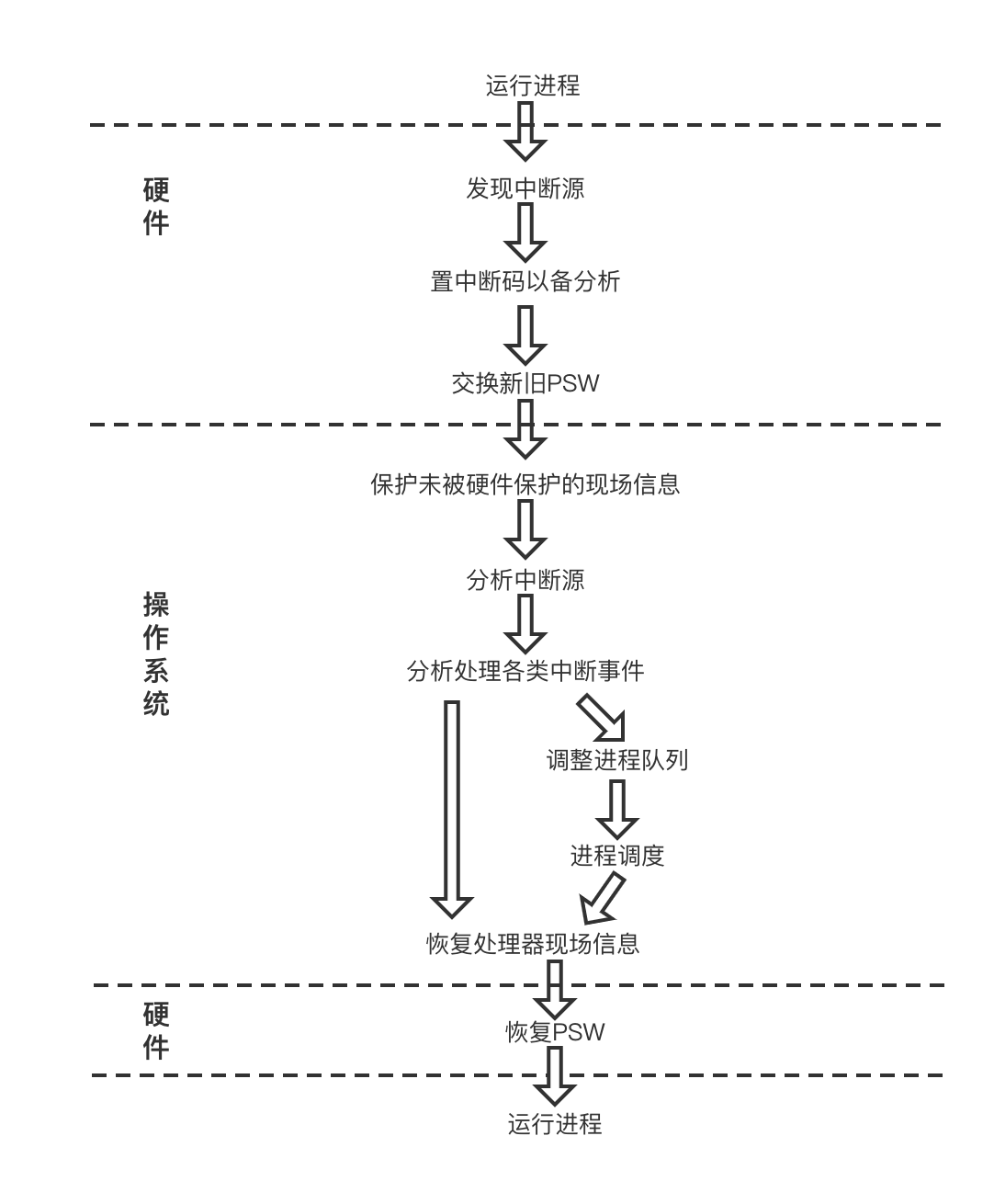 首先CPU需要将当前运行进程的上下文保存,从中断进程中分析PSW,确定对应的中断源和执行对应的中断处理程序。
