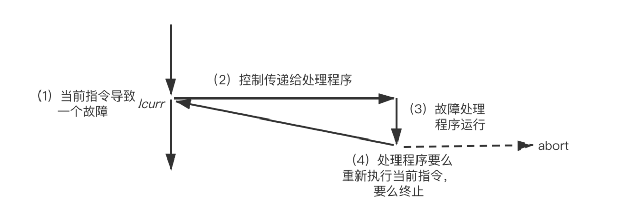 对于故障的处理,根据故障是否能够被恢复,故障处理程序要么重新执行引起故障的指令,要么终止。