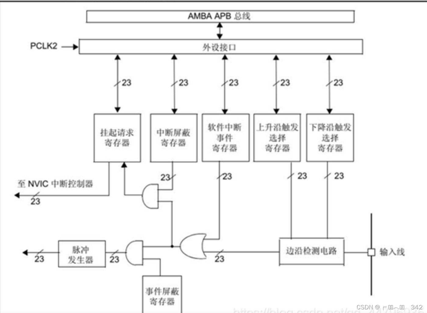 外部中断/事件控制器包含多达 23 个用于产生事件/中断请求的边沿检测器。每根输入线都可单独进行配置,以选择类型(中断或事件)和相应的触发事件(上升沿触发、下降沿触发或边沿触发)。每根输入线还可单独屏蔽。挂起寄存器用于保持中断请求的状态线。