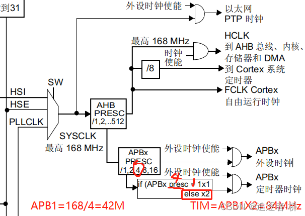 TIM3由于在配置APB1的时候使用了4分频,所以定时器进行了2倍频,为84MHz。