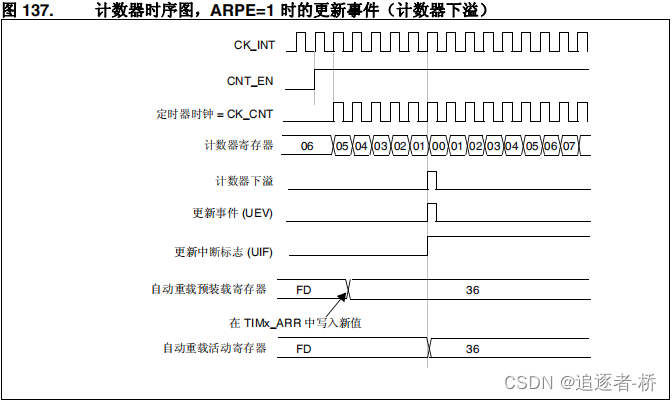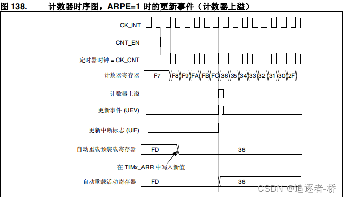 自动重载活动寄存器将以预装载值( TIMx_ARR 寄存器的内容)进行更新。注意,自动重载寄存器会在计数器重载之前得到更新,因此,下一个计数周期就是我们所希望的新的周期长度。