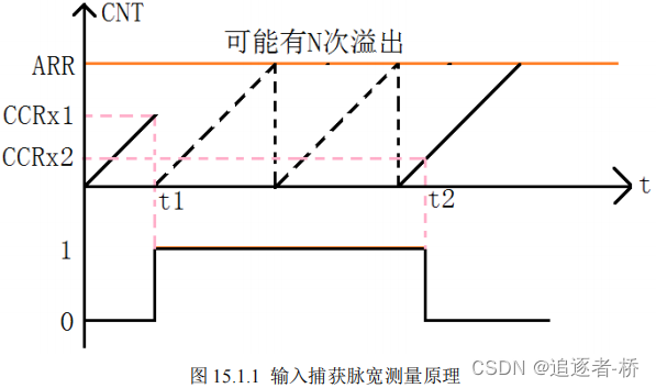 在 t1~t2 之间,可能产生 N 次定时器溢出,这就要求我们对定时器溢出,做处理,防止高电平太长,导致数据不准确。如图15.1.1所示,t1~t2之间,CNT计数的次数等于:N*ARR+CCRx2,有了这个计数次数,再乘以 CNT 的计数周期,即可得到 t2-t1 的时间长度,即高电平持续时间。