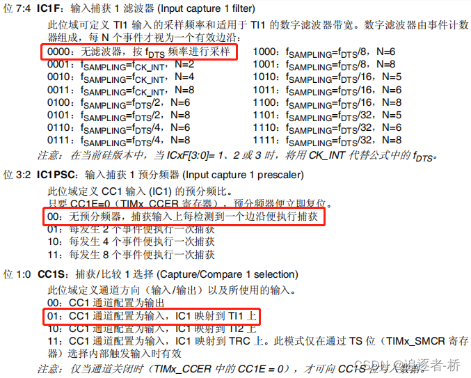 选择有效输入: TIMx_CCR1 必须连接到 TI1 输入,因此向 TIMx_CCMR1 寄存器中的CC1S 位写入 01 。只要 CC1S 不等于 00 ,就会将通道配置为输入模式,并且 TIMx_CCR1寄存器将处于只读状态。