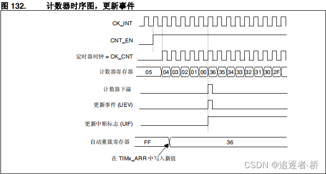 - 预分频器的缓冲区中将重新装载预装载值(TIMx_PSC 寄存器的内容)。
