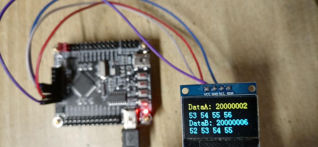 打开开关后,OLED屏上显示数组DataA和DataB的数据。DataA是源地址数据,DataB是目的地址数据,将DataA中的数据每隔一秒自增加一然后通过DMA控制器传输至DataB。为了加强效果,DataA中数据自增一后需要间隔一秒才会在DataB数组中的显示