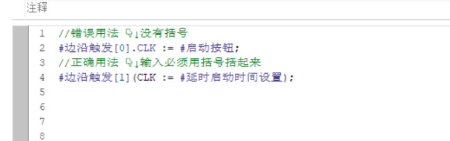 在使用上升沿指令,与被检测的bool位绑定时要将CLK:= 括在括号里面。