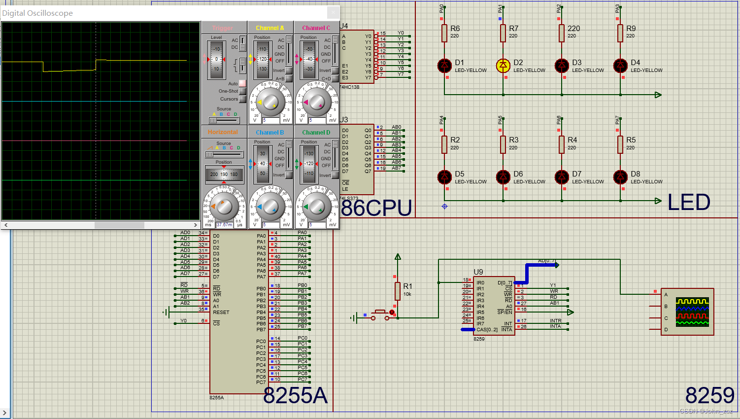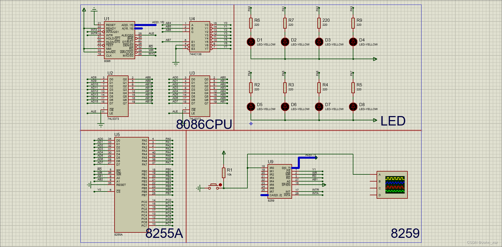 首先对8255进行端口定义,如下图所示,可以看到在8255A的A0和A1引脚连接的是AB1、AB2,CS引脚连接的是138译码器。那么8255控制字,AD15-AD0分别为:0000 0000 1000 0110B,转化为16进制就是 86H。那么控制A端口自然就是,0000 0000 1000 0000B,即80H,在本实验中,只用到了8255的端口A,所以只对A端口进行定义。