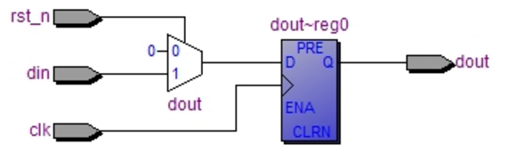 对比两者综合后的RTL视图,发现同步复位会多使用一些逻辑单元,这是因为一般的触发器都带有异步复位端;