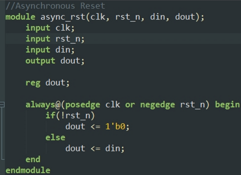异步复位是指无论时钟沿是否到来,只要复位信号有效,就对系统进行复位。异步复位RTL代码: