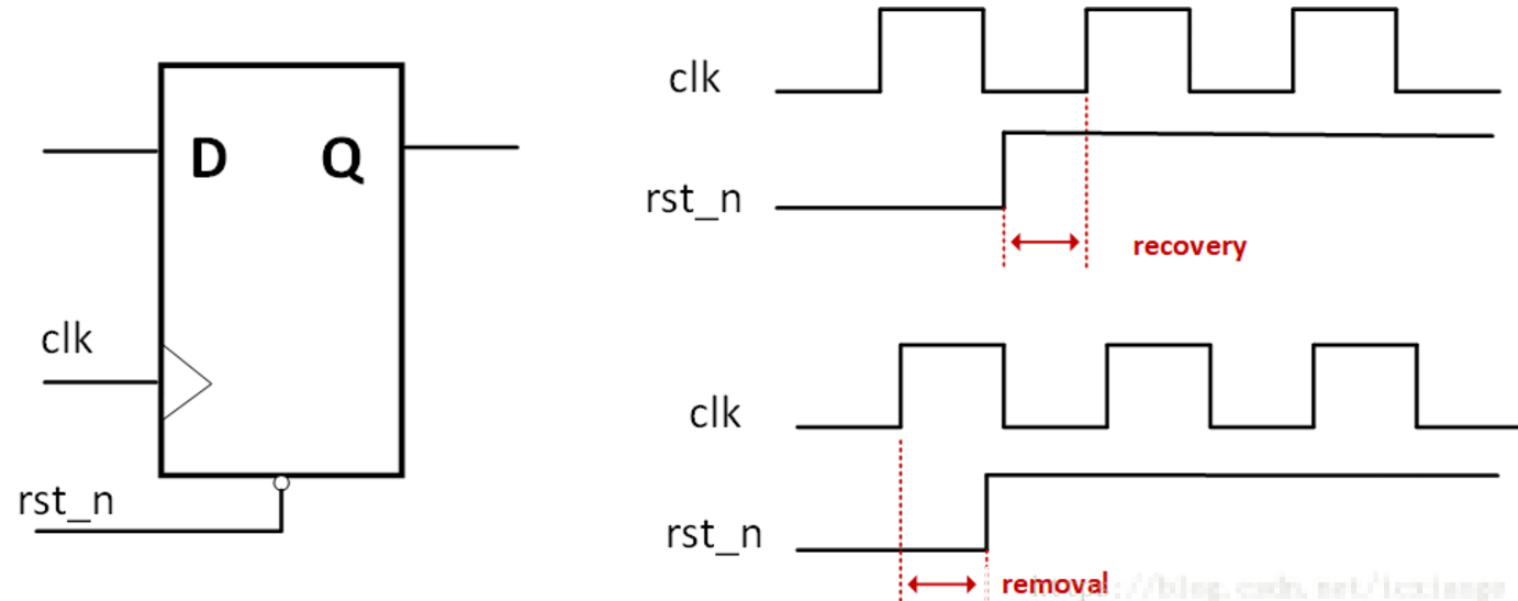 复位时,在时钟有效沿来临之后复位信号还需要保持为0的时间为去除时间removal time(去除时间),类似同步时钟hold time;