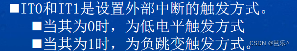 IT0是为外部中断INT0触发方式控制位,用于控制外部中断的触发信号。当IT0=1,负边沿触发方式(就是下降沿有效);当IT0=0,电平触发方式,低电平有效。IT1是为外部中断INT1触发方式控制位。