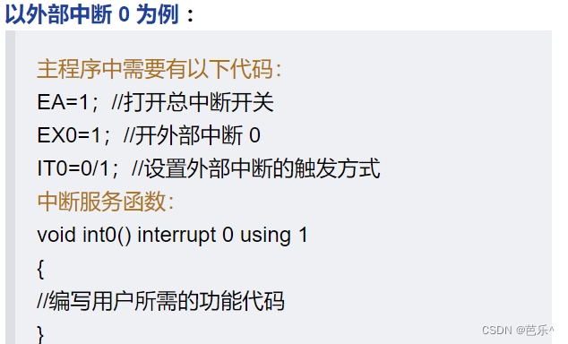 { //中断允许设置也采用位变量实现:EA=1;EX0=1;