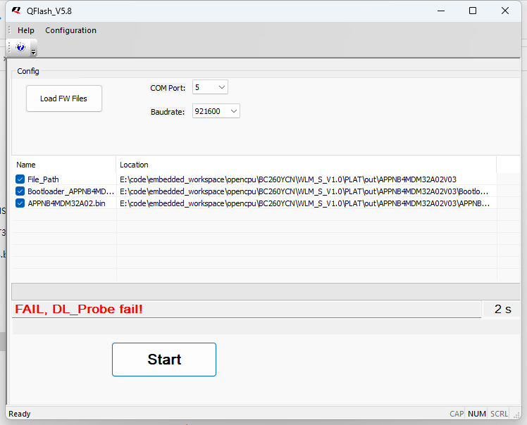 通过串口工具,连接到开发板的UART0口(开发板可以自行设计或官方购买),打开QFlash_v5.8软件,选择好COM口,波特率选择921600 ,点击“Load FW Files”按钮,在弹出的文件选择框中,选择刚才编译好文件目录中的flash_download.ini文件,