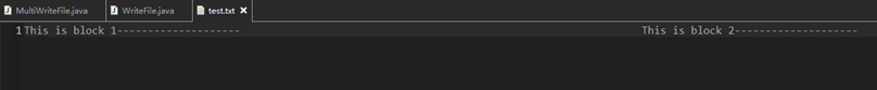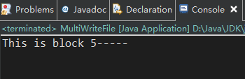 //写入文件: //创建WriteFile,指定不同线程写入不同的区块,并开启线程 //写入文件的顺序与线程的先后创建顺序无关,严格按照指定的区块去写 new WriteFile(file,5).start(); new WriteFile(file,3).start(); new WriteFile(file,1).start(); new WriteFile(file,4).start(); new WriteFile(file,2).start();