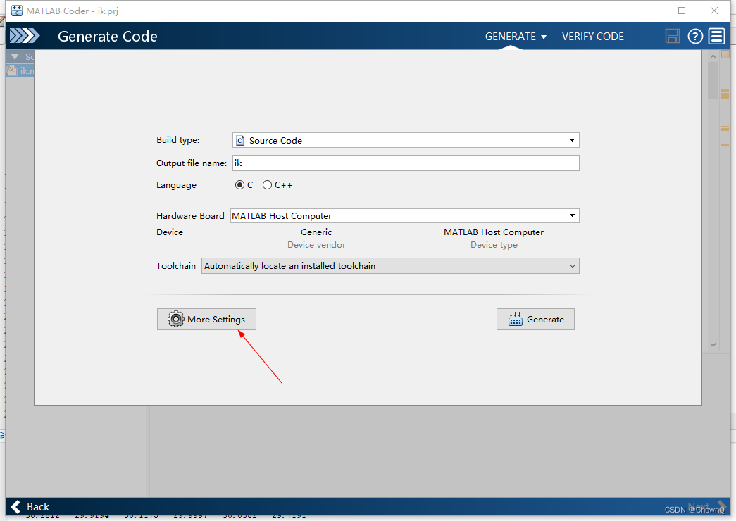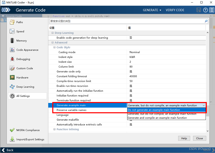 7、这里我自己建立main函数,不使用Matlab生成样例main文件。然后生成代码