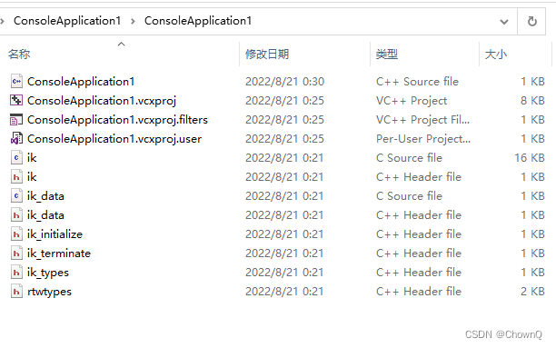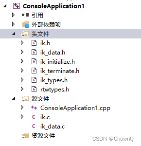 9、在VS里面新建一个C++控制台项目文件。将Matlab生成的codegen文件夹里面的代码复制到新建的C++项目文件夹里面。再在项目管理里添加现有项源文件和头文件。
