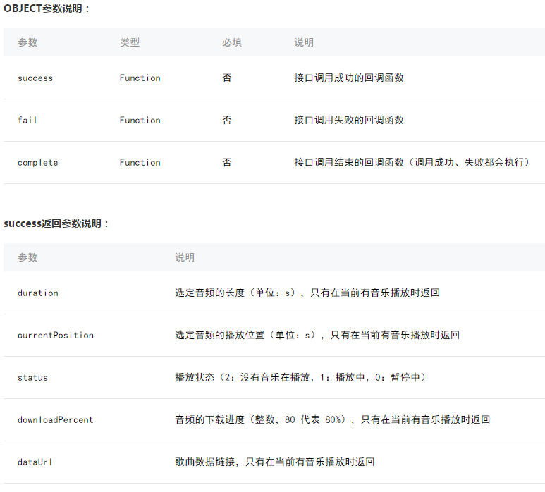 1.wx.getBackgroundAudioPlayerState(OBJECT):获取后台音乐播放状态。