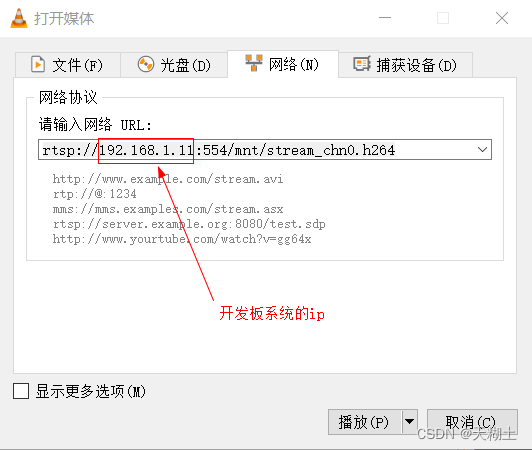 (3)接着在PC端运行VLC软件,选择“媒体—>打开网络串流”,输入“rtsp://192.168.1.11:554/mnt/stream_chn0.h264”(注意这里的ip是板载系统的ip),然后点击播放。