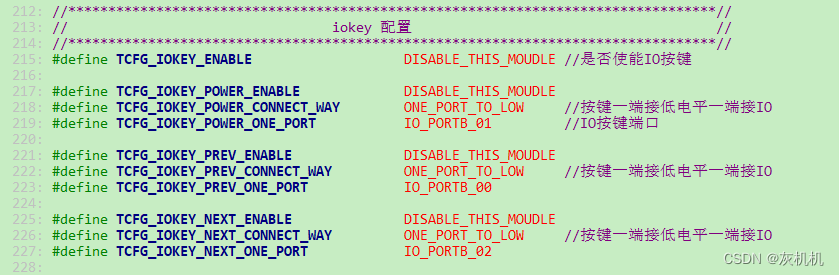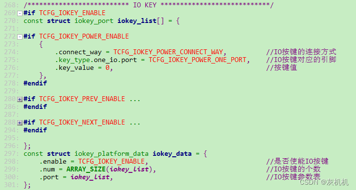 - IO定义配置:在使用IO按键前,需对IO按键的使能、方向、引脚等进行简单的定义配置,通常是在板级文件board_ac695x_demo_cfg.h中进行处理: