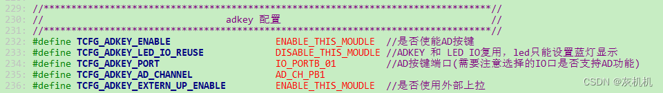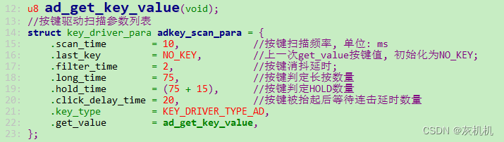 AD按键为例,在adkey.c中设置了参数列表(示例):