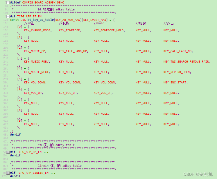 在不同类型的按键消息通过task_key.c中的映射管理,将消息和键值进行了一一对应,因此只需要在相应类型按键表格xxx_table.c中的对应模式中填写相应的事件即可。