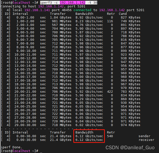 先用适配器类型为E1000e的主机142作为服务器,打流测试,带宽为6.12 Gbps,介于前两次测试之间。