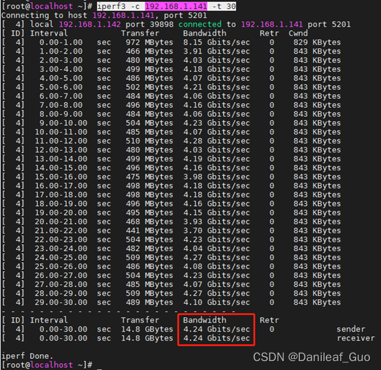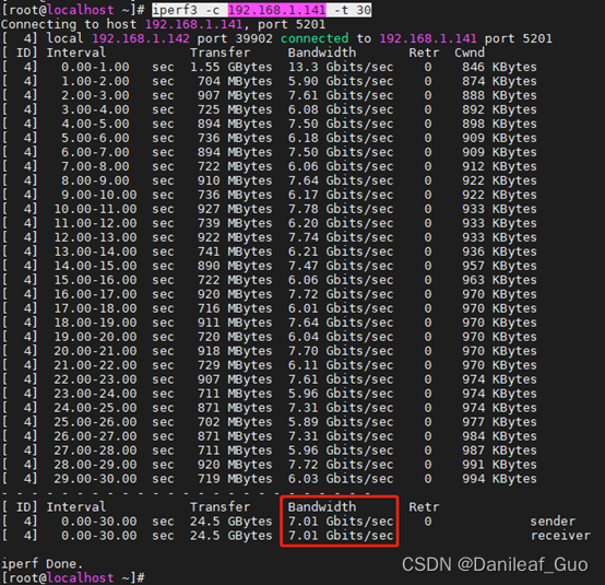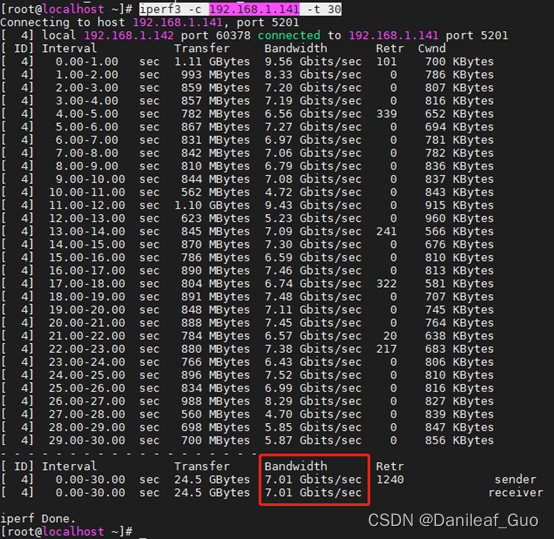 同样的,先用适配器类型为E1000e的主机141作为服务器,打流测试,带宽为7.01 Gbps。