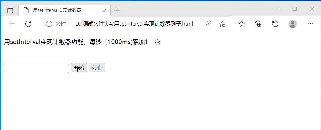 下面用setInterval实现计数器功能,每秒(1000ms)累加1一次,先看效果: