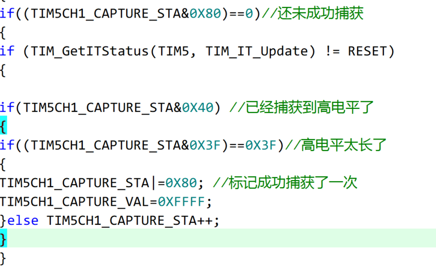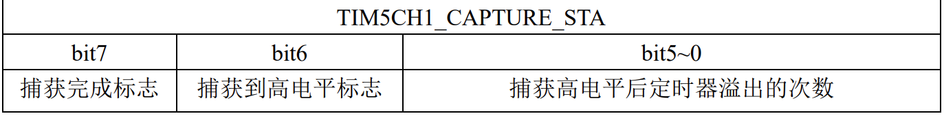 我们定义了一个变量TIM5CH1_CAPTURE_STA,这个变量的低六位是记录捕获高电平后溢出的次数,第七位是记录下已经捕获到高电平,第八位是记录下我们已经完成一次完整的捕捉。