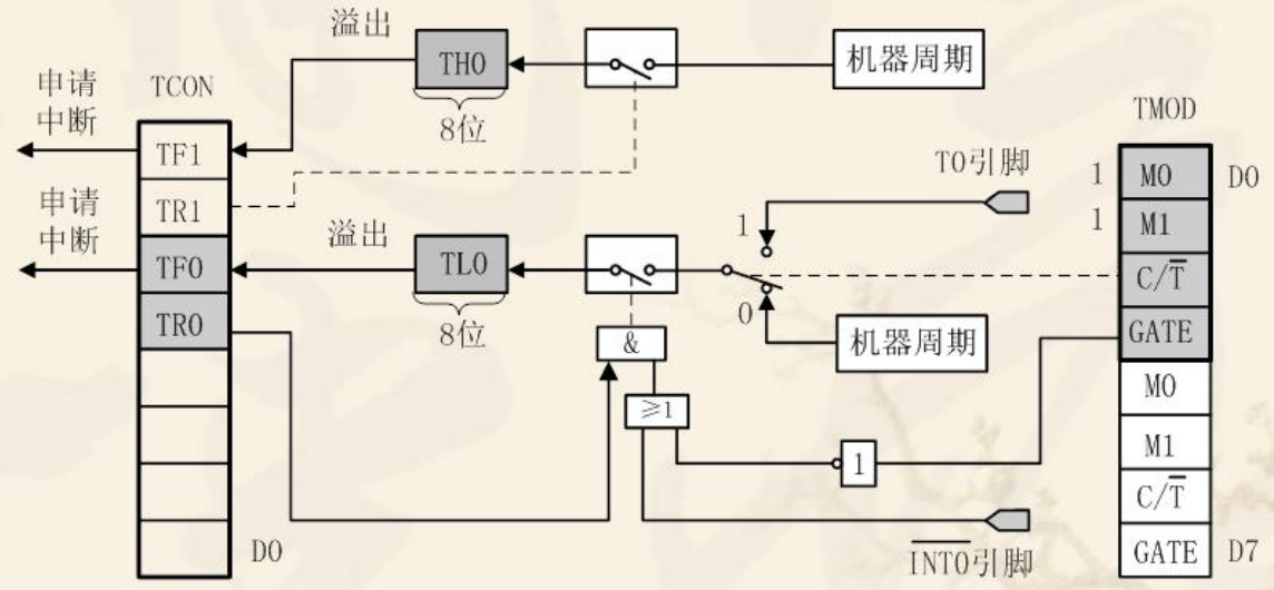 定时/计数器的实质是加 1 计数器(16 位),由高 8 位和低 8 位两个寄存器 THx 和 TLx 组成。随着计数器的输入脉冲进行自加 1,即,每输入一个脉冲,计数器就自动加 1,当加到计数器为全 1 时,再输入一个脉冲就使计数器回零,且计数器的溢出使相应的中断标志位(TF0/TF1)置 1,向 CPU 发出中断请求(定时 /计数器中断允许时)。如果定时/计数器工作于定时模式,则表示定时时间已到; 如果工作于计数模式,则表示计数值已满。所以,由 “溢出时计数器的值” 减去 “计数初值” 才是加 1 计数器的计数值。