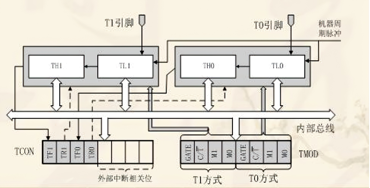 图中的 T0 和 T1 引脚对应单片机 P3.4 和 P3.5 管脚。定时/ 计数器的工作由两个特殊功能寄存器控制。