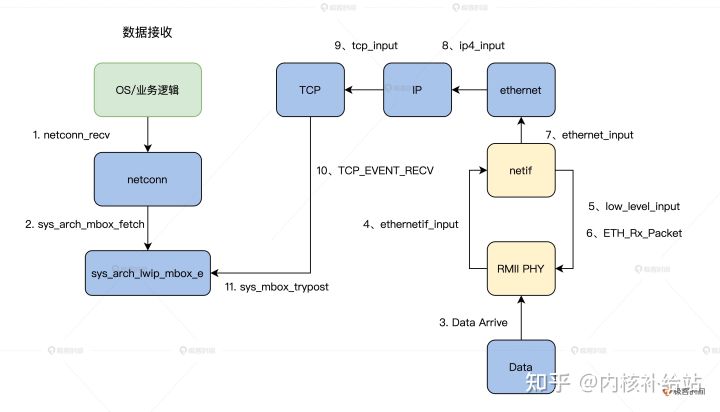数据接收需要应用程序首先调用 lwIP 的 netconn 层的 netconn_recv 接口。然后由 netconn 层调用 sys_arch_mbox_fetch 函数,进入监听等待相关的 mbox。