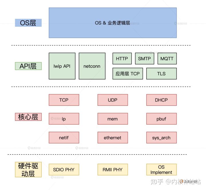 lwIP在结构上可分为四层:OS层、API层、核心层、硬件驱动层,如下图所示: