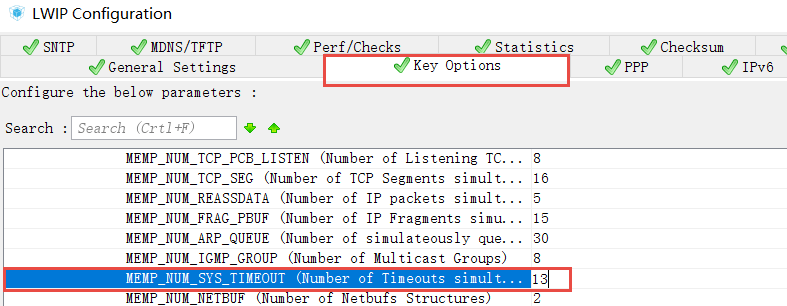 查找了一番发现这个是由MEMP_NUM_SYS_TIMEOUT大小设置不合适造成的,我使用的是STM32CubeMX生成的代码,打开ioc文件,在lwip配置中选择Key Options,将MEMP_NUM_SYS_TIMEOUT设为13(默认是3)