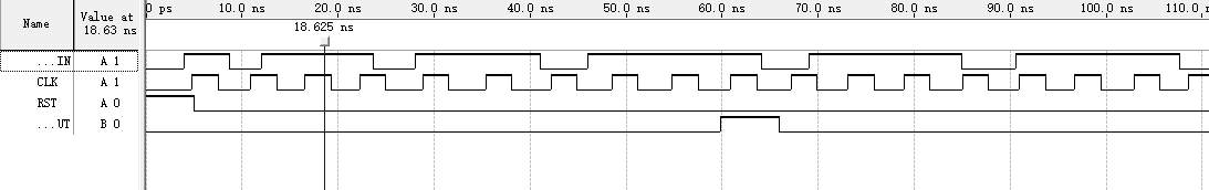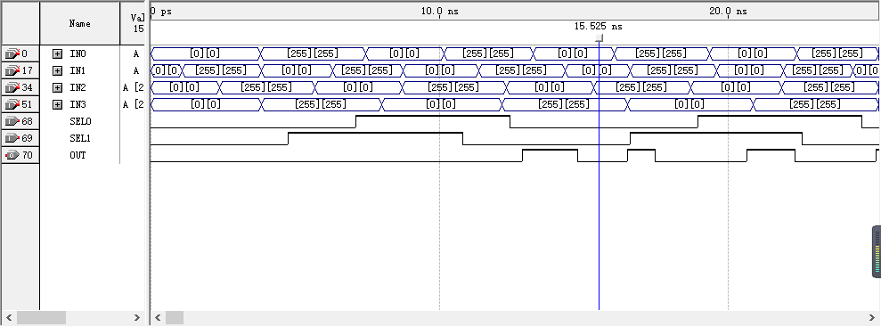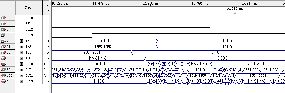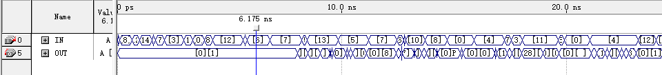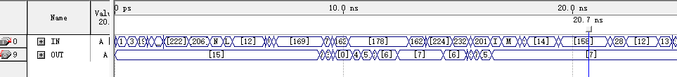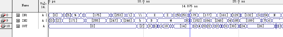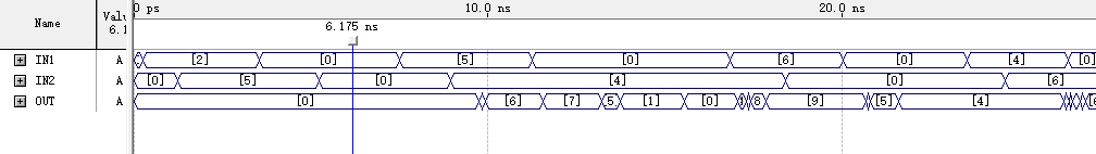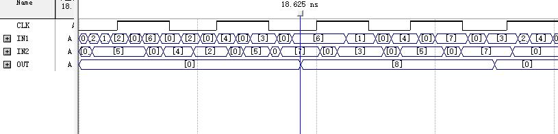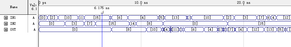 如图可知,输出存在时延,且当正确结果大于15后只输出正确结果的后4位,如IN1输入为11,IN2输入为7时,OUT最终显示8。