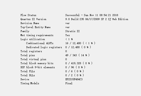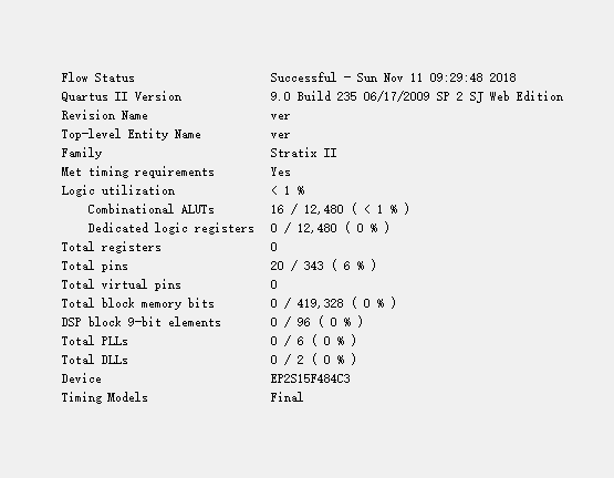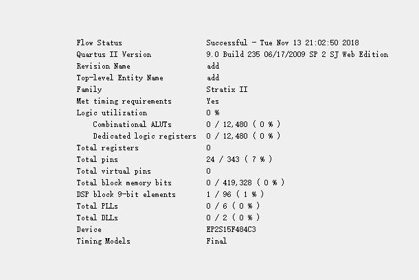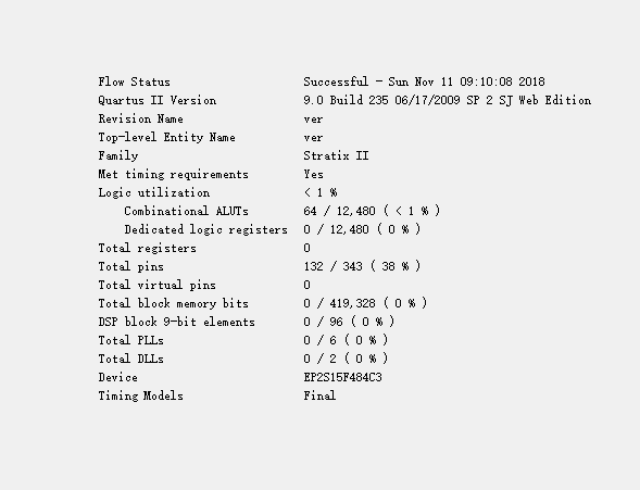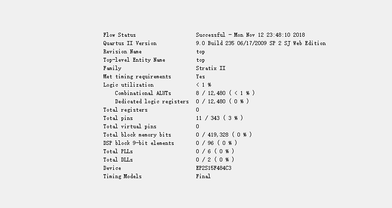- 选一款没有硬件乘法器的FPGA芯片(例如Cyclone EP1C6)对比8比特的乘法器和加法器两者编译之后的资源开销(Logic Cell的数目)