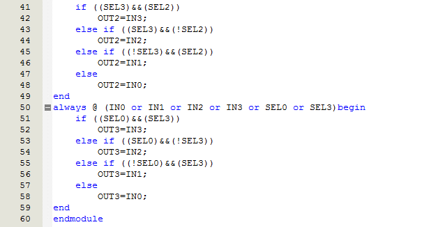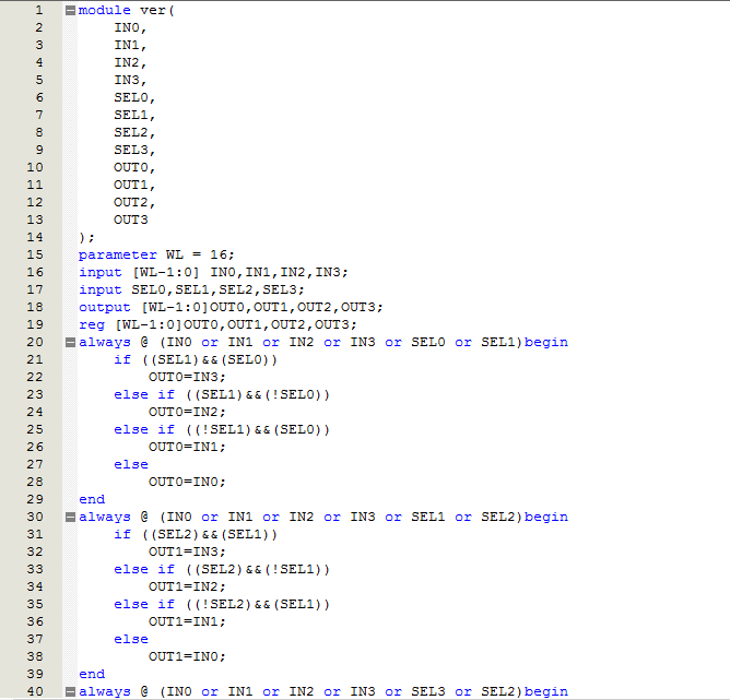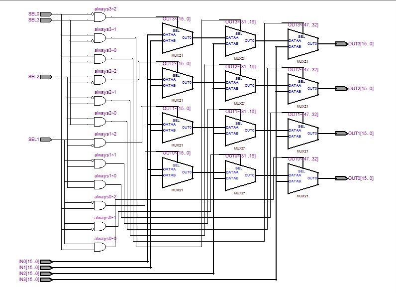 对比2选1的mux(如下图),可以看出4选1的mux实际上就是在2选1的mux上进行拓展,选用2位的控制信号控制4位输入信号择输出,资源消耗较2选1的mux要多。