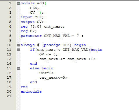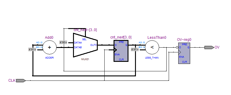- 设计一个最简单的计数器,只有一个CLK输入和一个OVerflow输出,当计数到最大值的时钟周期CLK输出1
