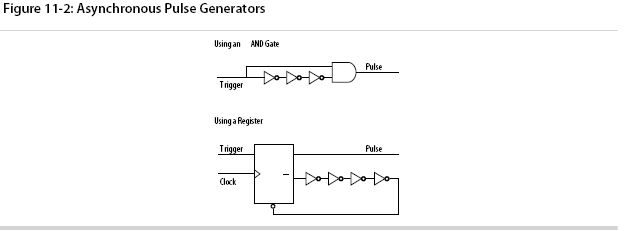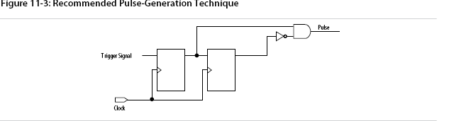 The pulse width is always equal to the clock period. This pulse generator is predictable, can be verified with timing analysis, and is easily moved to other architectures, devices, or speed grades.