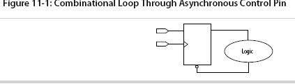 You should avoid combinational loops whenever possible. In a synchronous design, feedback loops should include registers. For example, a combinational loop occurs when the left-hand side of an arithmetic expression also appears on the right-hand side in HDL code. A combinational loop also occurs when you feed back the output of a register to an asynchronous pin of the same register through combinational logic.