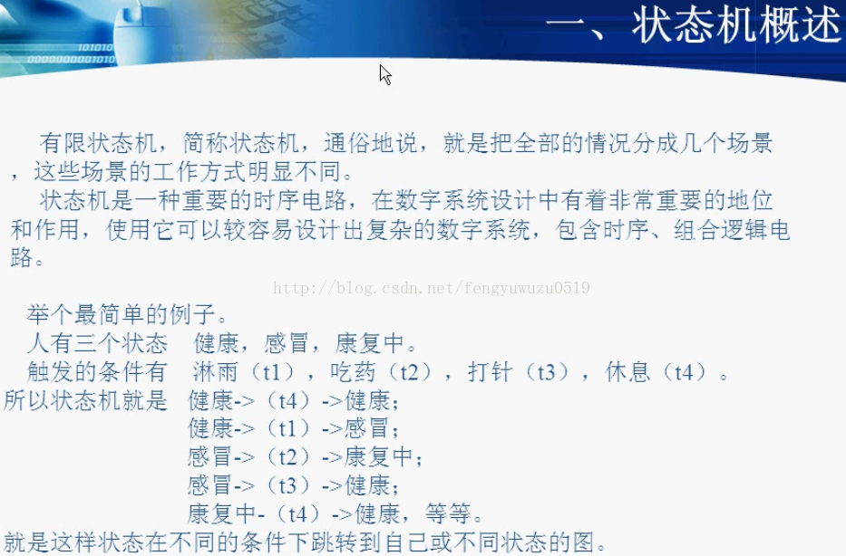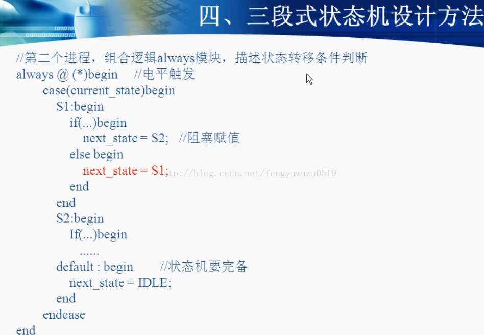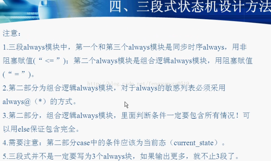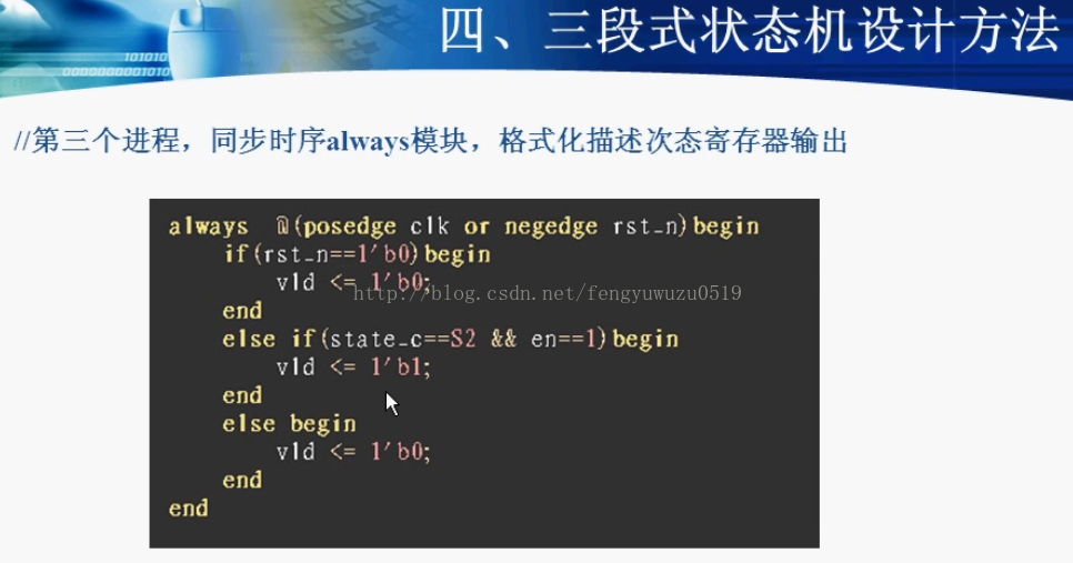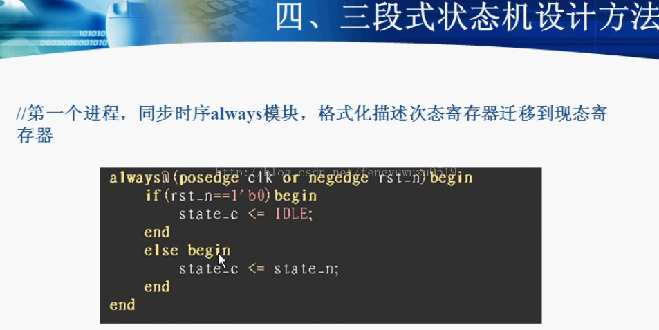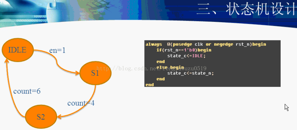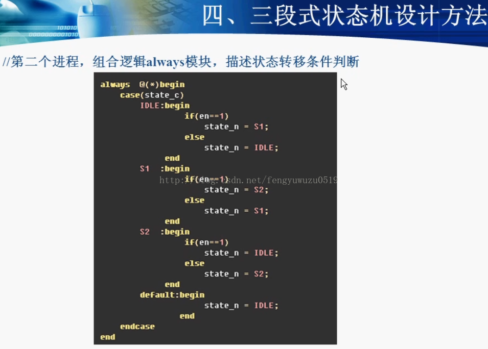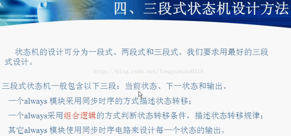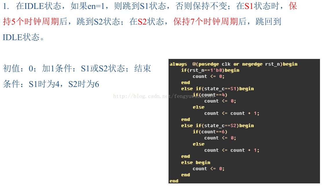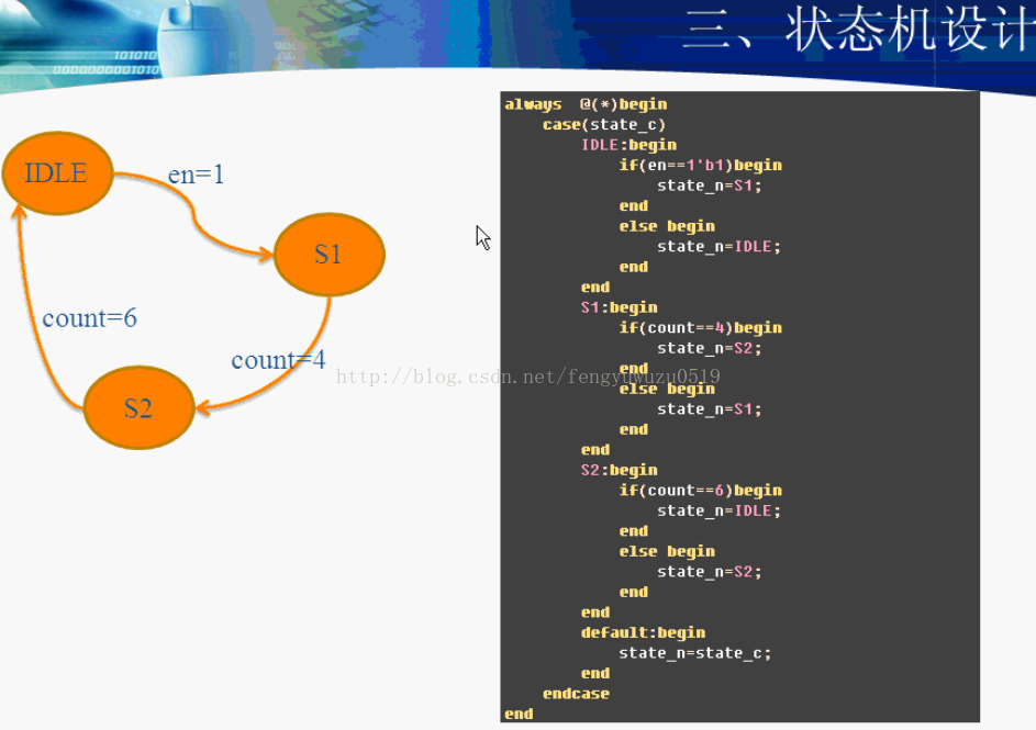 以上就是平常麦片最近收集整理的关于FPGA学习(第7节)-Verilog状态机(状态按条件切换) 一、状态机设计要点 二、Verilog实现状态机练习题的全部内容,更多相关FPGA学习(第7节)-Verilog状态机(状态按条件切换)内容请搜索靠谱客的其他文章。