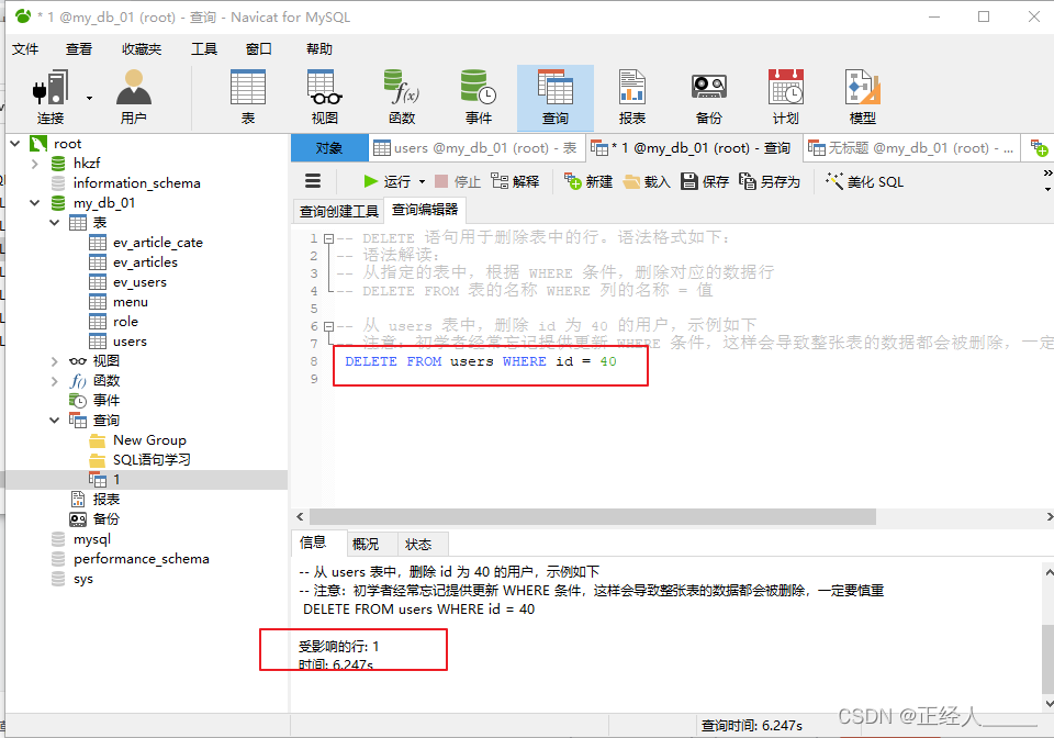 -- 从 users 表中,删除 id 为 40 的用户,示例如下