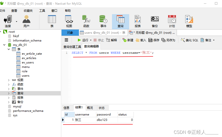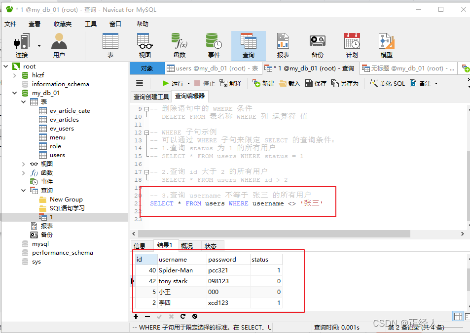 -- 1.查询 status 为 1 的所有用户