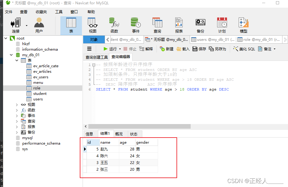 -- SELECT * FROM student WHERE age > 18 ORDER BY age LIMIT 3 # 年龄大于18的前3条数据