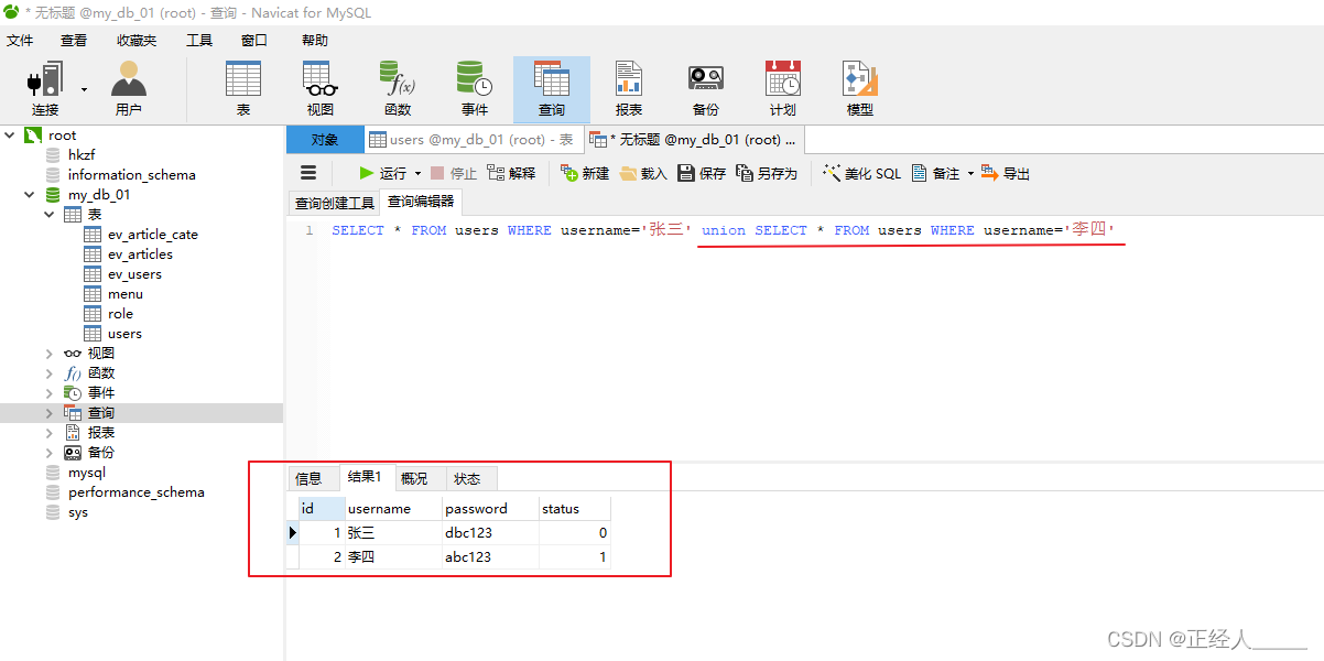 SELECT * FROM users WHERE username='张三' union select * FROM users WHERE username='李四'