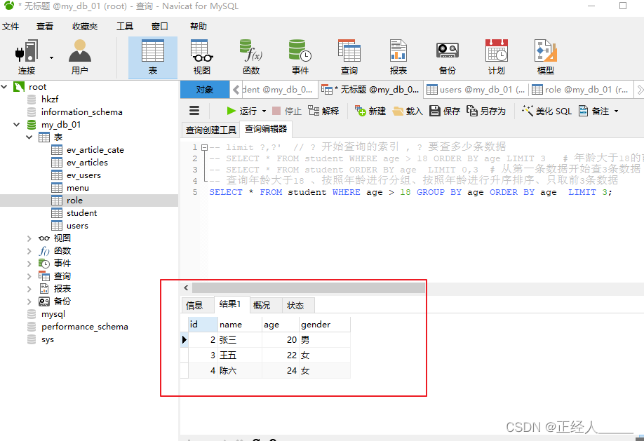 -- 查询年龄大于18 、按照年龄进行分组、按照年龄进行升序排序、只取前3条数据