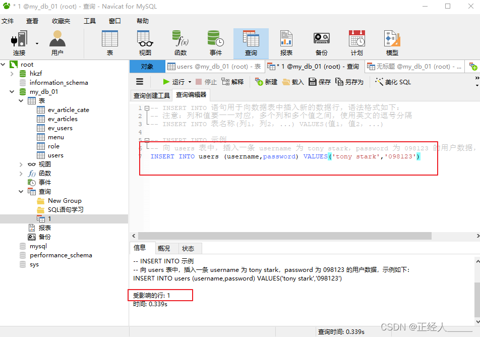 -- 向 users 表中,插入一条 username 为 tony stark,password 为 098123 的用户数据,示例如下: