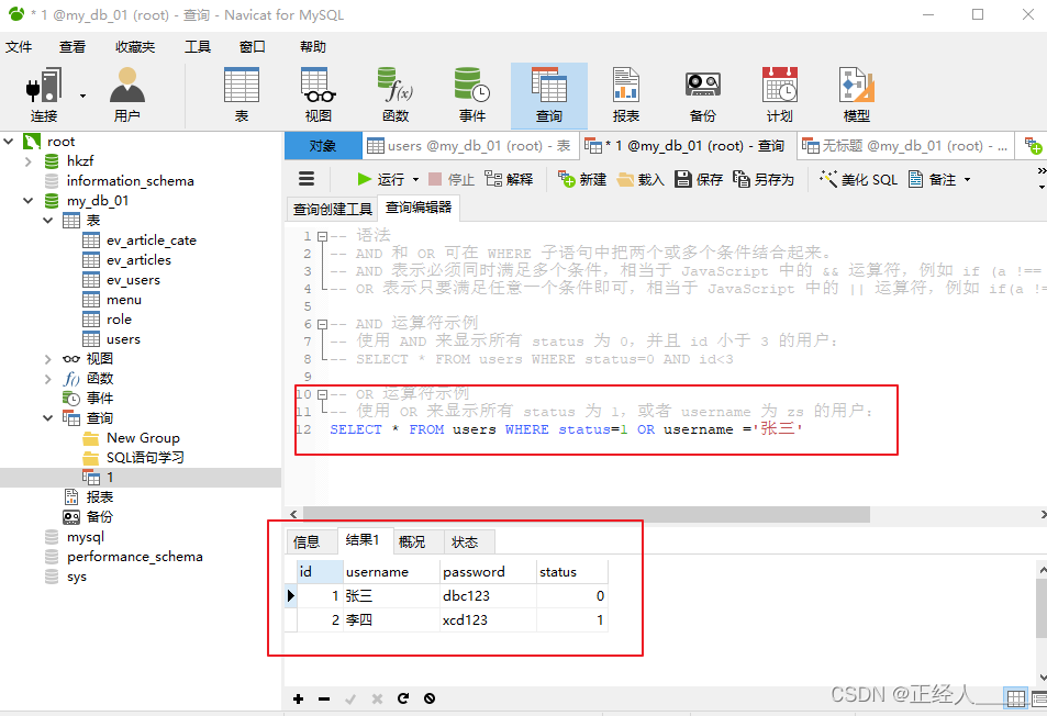 -- 使用 OR 来显示所有 status 为 1,或者 username 为 zs 的用户: