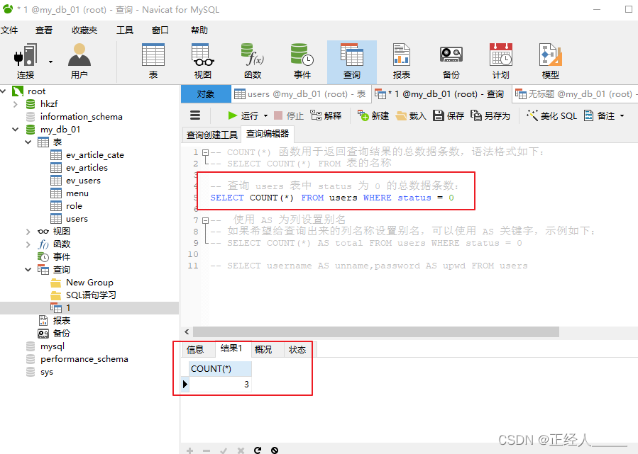 -- 查询 users 表中 status 为 0 的总数据条数: